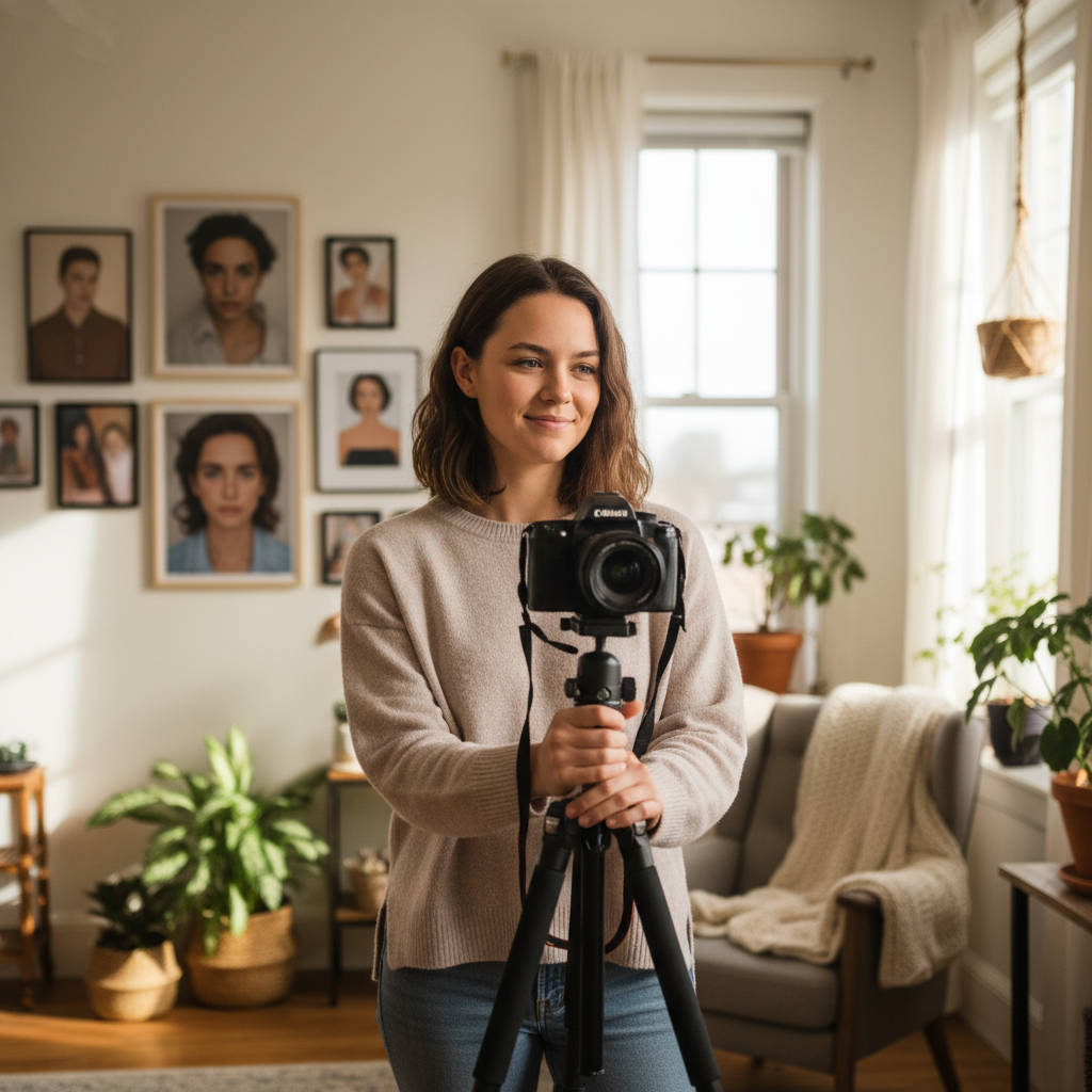 Nie potrzebujesz studia ani softboxa. Wystarczy parapet i kawałek światła. Albo ulubiony kąt pokoju, w którym czujesz się bezpiecznie. Pamiętaj, że to przestrzeń, która ma Cię wspierać, a nie wymuszać pozowanie jak influencerka na Bali.
